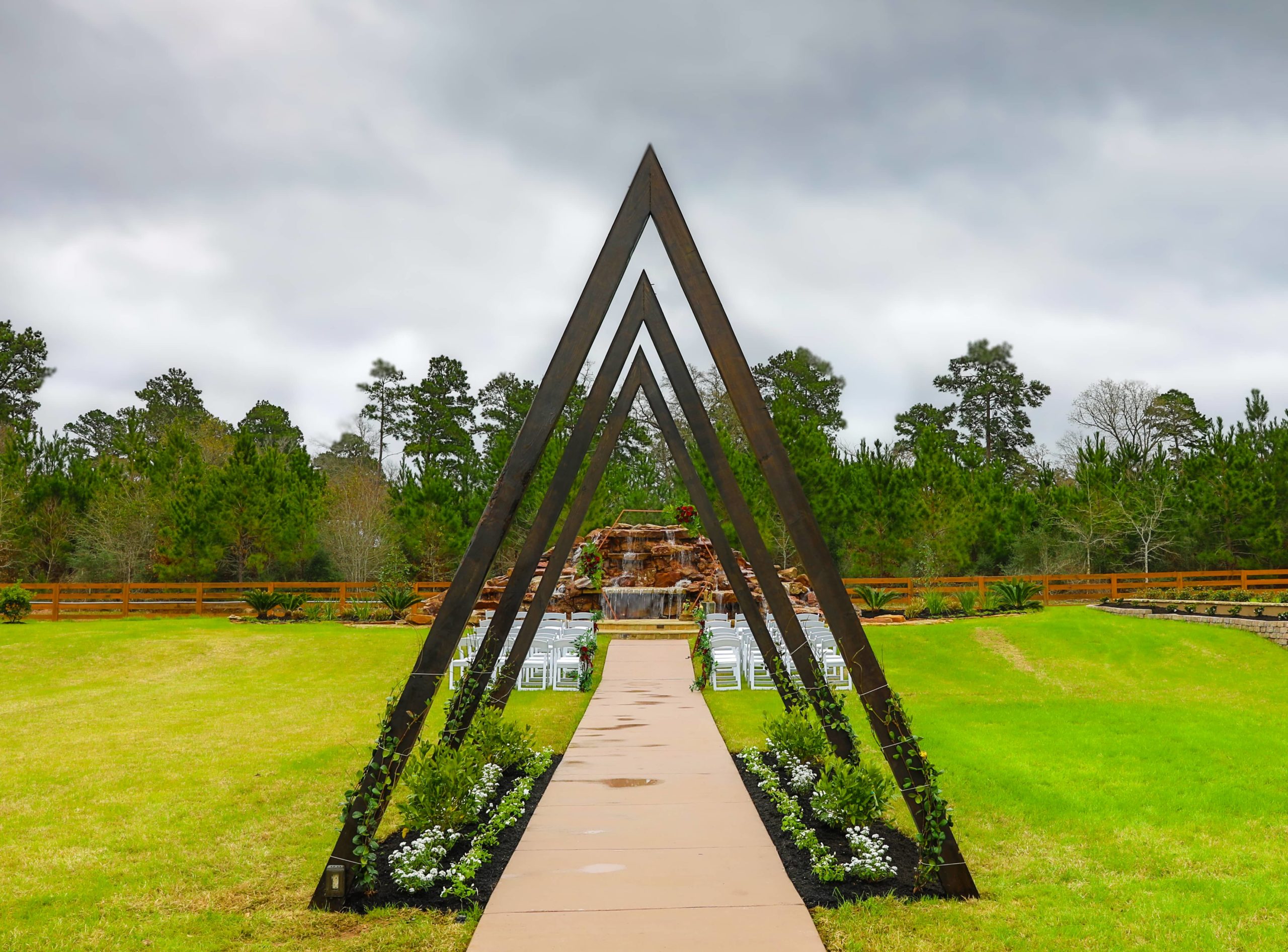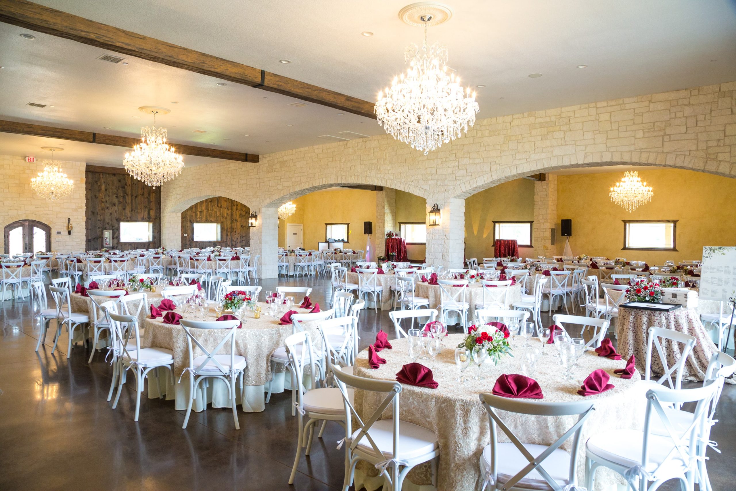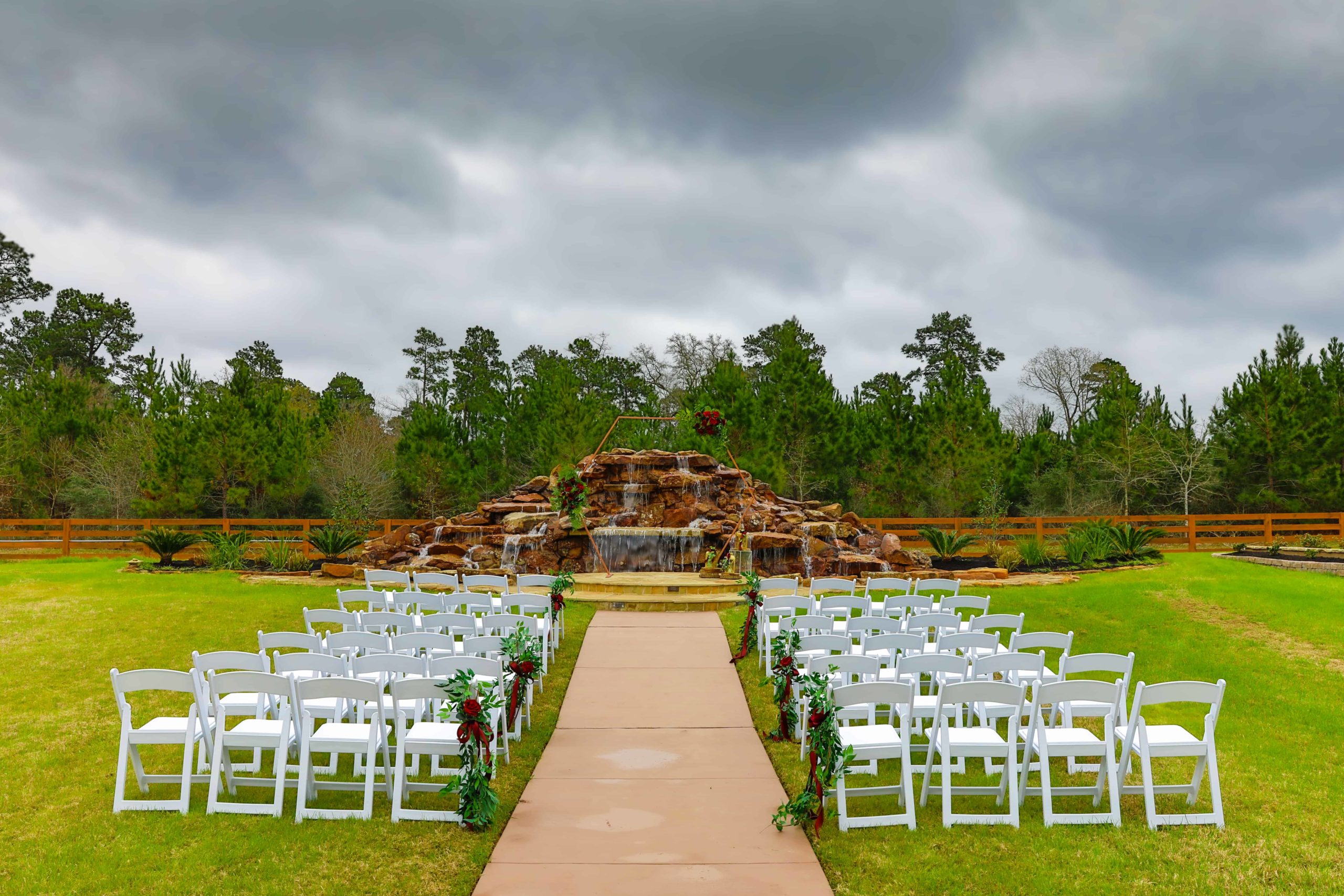 The Falls Event Venue is a beautiful wedding and special event venue that is capable of hosting events for up to 300 guests. This venue evokes the charm and elegance of Southern Texas, featuring a beautiful modern event space as well as up to 10 acres of complimentary space for bridal and wedding party photos. The venue features both indoor and outdoor ceremony options. The Waterfall provides a stunning outdoor backdrop complete with a gorgeous waterfall, lush green landscapes, and an idyllic outdoor event space. The Reception Hall exudes elegance and sophistication, featuring large Victorian glass iron doors and various classical era decor. The interior of the Reception Hall includes large stone arches and chandeliers that give off a warm glow. This venue includes grooms’ quarters on the second floor complete with a pool table, lounge area, dressing room, bar, and fully-functional theater room. The Bride’s room includes a large decorated kitchen, private bath, dressing room, beautiful full length mirror, a 3 station make up room. A must see for any Bride!